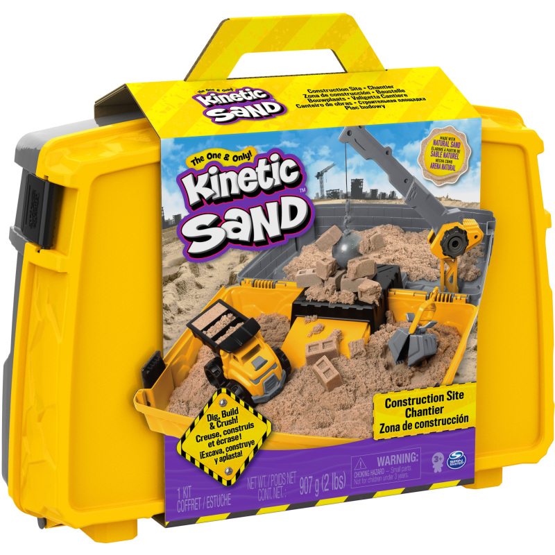 Graaf, bouw en verpletter met de Kinetic Sand-bouwplaatsspeelset. Deze opvouwbare zandbakspeelset met een speciaal bouwplaatsthema bevat alles wat je nodig hebt om je eigen bouwplaats te maken. 907 g bruin Kinetic Sand, een kiepwagen en een kraan die écht werkt, met sloopkogel en emmer. Kinetic Sand is het originele magische, kneedbare en betoverende zand. Het glijdt door je handen en droogt niet uit, dus je kunt er telkens opnieuw mee spelen. Open de zandbak en ontdek een omsloten speelvak, waar je je eigen bouwplaats kunt opbouwen. Gebruik de emmer van de kraan om Kinetic Sand op te graven en vul de kiepwagen. Laad de kiepwagen daarna met Kinetic Sand en maak maar liefst drie bakstenen tegelijk. Bouw een muur op het baksteenplatform. Tijd om de boel te slopen? Hang de sloopkogel aan de kraan en draai ‘m om de muur te slopen. Druk het zand van de gesloopte muur weer aan en bouw telkens weer opnieuw. Klaar met spelen? Doe alle spullen in de zandbak tot een volgende keer, of neem je bouwplaats mee onderweg. Wil je nog meer bouwplezier, gebruik dan de speelsets Asfalteren en spelen en Graven en slopen (elk apart verkocht) bij je bouwplaats. Laat het Kinetic Sand door je handen glijden…Het is zo leuk, dat je er niet meer mee wilt stoppen. Kinetic Sand, het perfecte cadeau voor kinderen, is gemaakt van natuurlijk zand en is tarwe-, gluten- en caseïnevrij. Beleef eindeloos bouwplezier met de Kinetic Sand-bouwplaats.