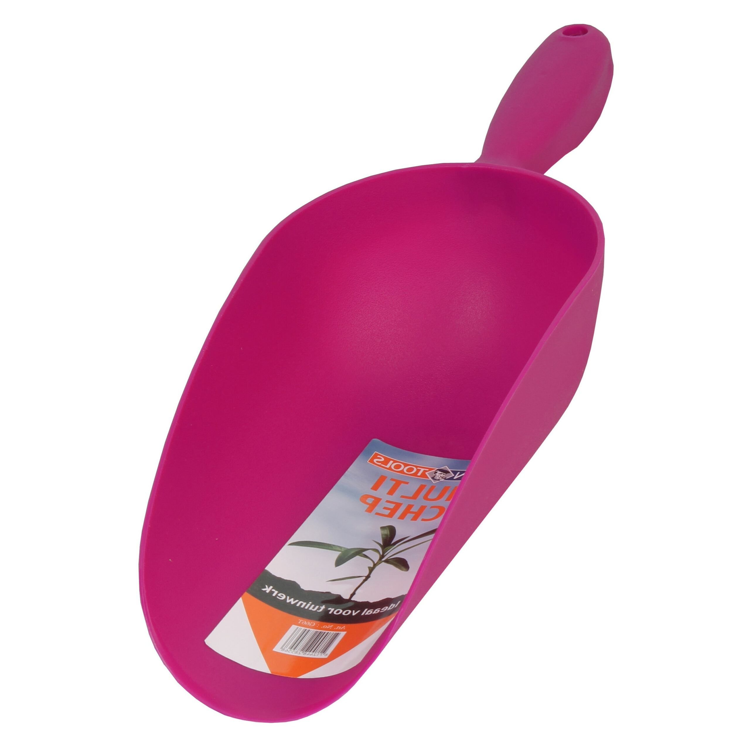 Multifunctionele toepasbare schep in het roze gemaakt van onbreekbaar kunststof die voor verschillende doeleinden te gebruiken is, bijvoorbeeld het voederen van dieren, dakgoot legen, grond verplaatsen in de tuin of zandbak en/of zout, compost strooien. Met stevig handvat voor goed grip. Afmetingen: 32 x 12 x 9 cm.