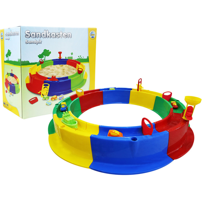 Complete Wader zandbak gemaakt van stevig kunststof. De zandbak is voorzien van een gracht waar je water in kunt laten stromen. De zandbak bestaat uit acht delen die je zelf in elkaar moet zetten. Door de afdichtstrips is de zandbak waterdicht en kan de rand worden gevuld met water. Inclusief vier auto’s, een boot, een zandmolen, een watermolen en drie watersluizen.