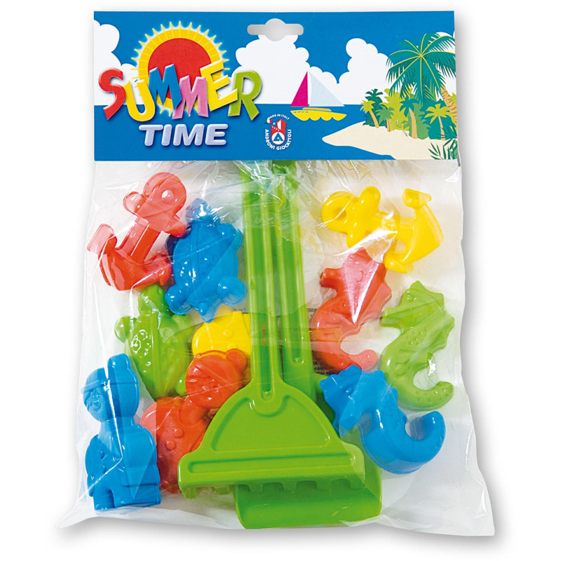 Complete speelset voor op het strand. De set bestaat uit een harkje, een schepje en 10 verschillende kleine zandvormpjes. Leuk voor op het strand of in de zandbak. Alle onderdelen uit de set zijn gemaakt van kunststof.